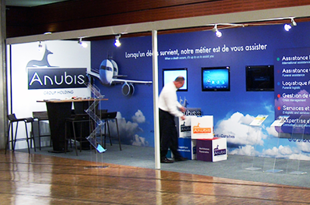 À l’occasion d’un salon professionnel, nous avons réalisé l’installation de bâches imprimées grand format et de décrochés d’images pour le stand ANUBIS GROUP. Le dispositif visuel comprend des bâches tendues sur structure métallique ainsi qu’un visuel découpé en relief représentant un avion sortant du décor, créant un effet tridimensionnel particulièrement attractif pour les visiteurs.