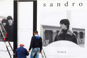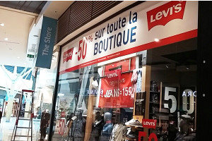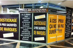 Pose d'adhésifs publicitaires sur les vitrines du magasin DESTOCK'JEANS ainsi que sur son enseigne.